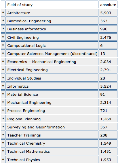 Viyana Teknik Üniversitesi 5 Ocak 2021 tarihinde bölümlere göre öğrenci mevcutları (Lisans, yüksek lisans, diploma ve doktora)